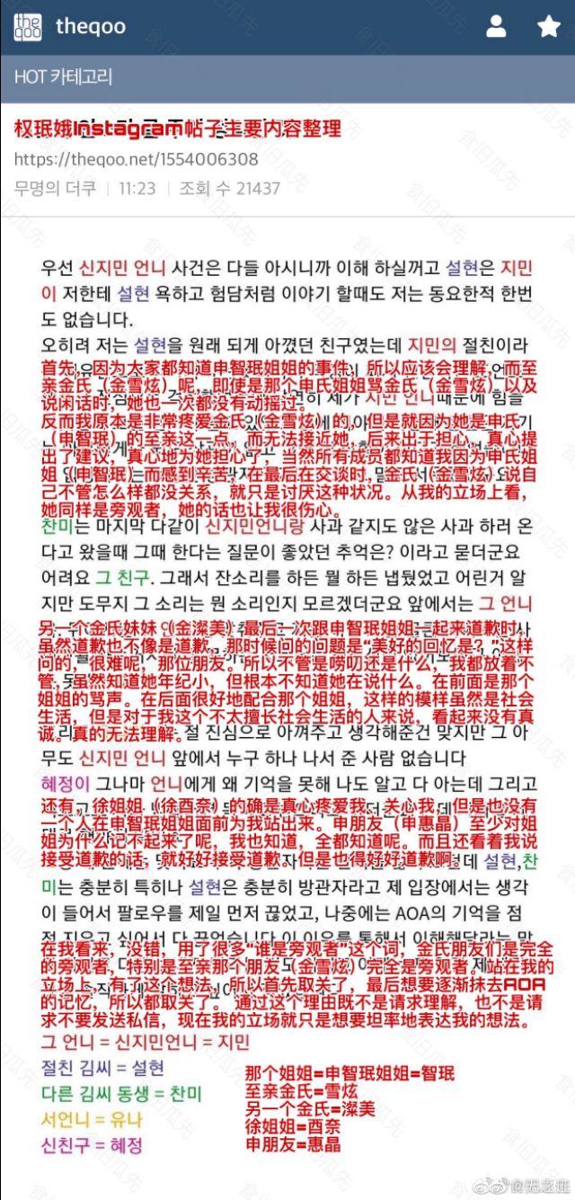 Source: n.sinaimg.cn 权珉娥在帖子中表示,女团中的一名成员曾不断欺负和折磨她,这名成员是jimin申智珉。 7月3日,权珉娥在个人 在此期间,申智珉在自己的instagram故事上分享了一篇黑屏,上面有 小说 二字,很快她就删除了。 在这之后,权珉娥又分享了一篇文章,内容如下。